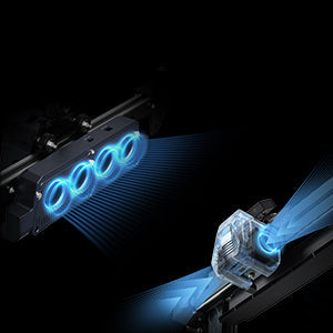 En plus des deux ventilateurs à roulements à billes 4015 renforcés sur les deux côtés de la tête d'impression, l'imprimante est équipée de quatre ventilateurs auxiliaires à roulements à billes 4020 situés à l'arrière de la tête d'impression. Cette configuration assure un refroidissement omnidirectionnel rapide des nouvelles couches imprimées, même à une vitesse d'impression élevée. Le filament chauffé se lie rapidement, garantissant de meilleurs résultats pour les surplombs et les ponts.