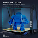 And the 250W hotbed can quickly heat up to 100ºC, compatible with PLA, ABS, ASA, PETG, TPU, and similar filaments.