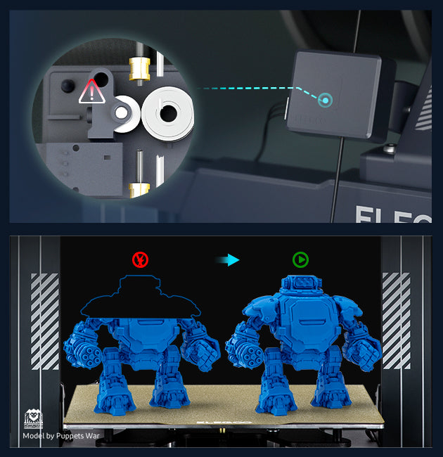 With a filament detection sensor, whenever the filament runs out or breaks, the printer will pause and alert you until you load the new filament, helping to avoid material waste and model scrapping.