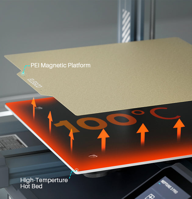 The PEI magnetic platform features a special coating and a spring steel sheet for strong adhesion and anti-warping, allowing you to easily remove or eject the printed models by slightly bending the steel sheet.