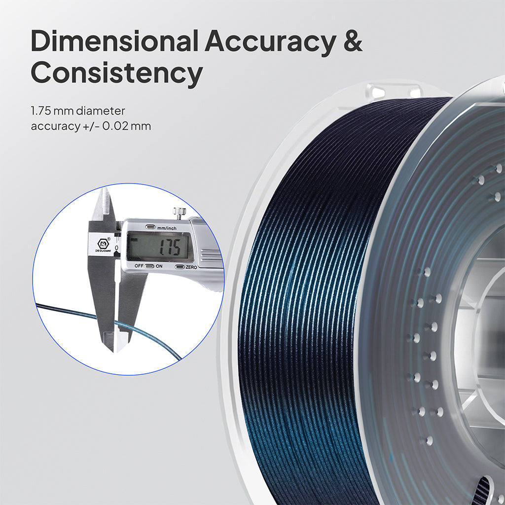 La tolérance stricte de diamètre de 1,75 mm (précision dimensionnelle +/- 0,02 mm) garantit un approvisionnement fluide, réduisant considérablement les risques de bouchage de la buse et améliorant le taux de succès d'impression. Une déformation minimale et peu ou pas d'odeur pendant le processus d'impression vous offrent une expérience d'impression 3D sans tracas.